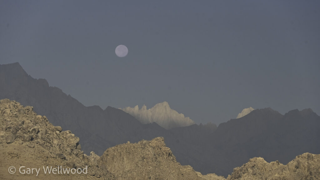 Gary recently returned from a Highway 395 solo excursion with his kayak and shared some wonderful images from his trip. Although he photographed the Sept 7th moonrise under the Coronado Bridge, he preferred his great images of moonset over the Eastern Sierras from Lone Pine. Photographing the moon setting at sunrise is a recent alternative of shooting the moon that we are exploring. A balanced exposure is less challenging when photographing the moon setting at sunrise. Plus it’s westward so it opens up a whole new set of foreground elements, like Mt Whitney. Other images from his trip are always historical, educational and fascinating. He also shared a flash photo taken on film where he had some help illuminating a ship with a flash during a long exposure aka ‘flash painting’.