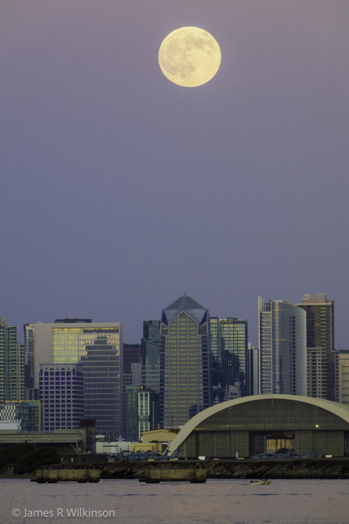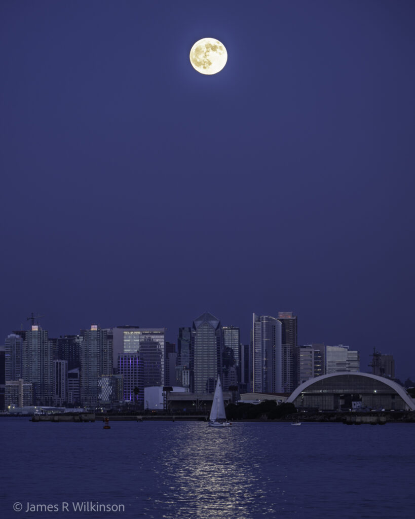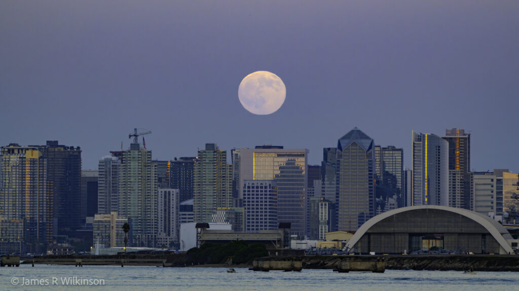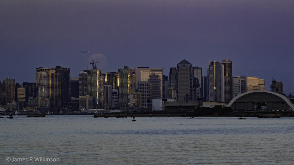 Jim shared a sequence of photos of the moonrise Oct 6th over the San Diego skyline from Shelter Island. It’s difficult to get any further west because North Island hangers obstruct the skyline. PhotoPills suggested the moon would rise over One America Plaza if we setup at the fishing pier. But it came up a few buildings north and did not align with One America Plaza tip till it was higher in the sky. We’ll keep trying – the weather also was hazy so the first image of the moonrise were subtle. Plus, we hoped to get the building lights but they did not come on till after 7pm. When the moon was pretty high in the sky.