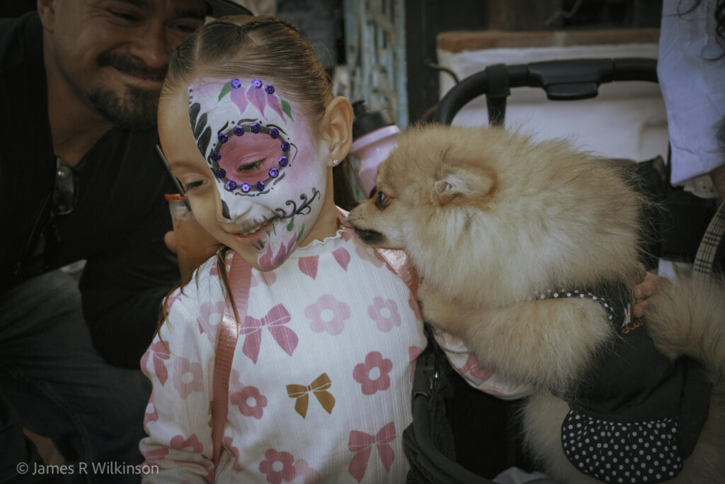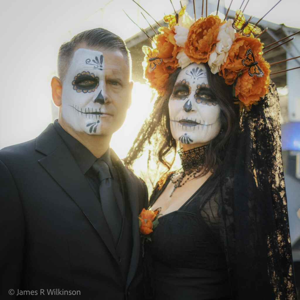 Jim participated in both the Nov 1st Old Town Dios de los Muertos meetup and the Nov 5th UCSD Fallen Star moonrise. For the Old Town Dios de los Muertos images, he used a Fujifilm X100VI in 50mm mode to capture the portraits. This camera has a small built-in flash he used as fill flash to reduce shadows especially on backlit shots. This camera has a leaf-shutter so it can flash-sync at any shutter speed, even 1/4000. It has a 35mm equivalent fixed focal length lens, but can “zoom” (crop in-camera) to 50mm or 70mm.