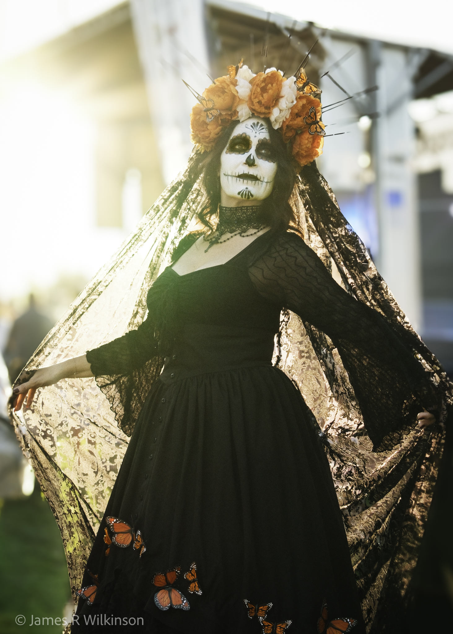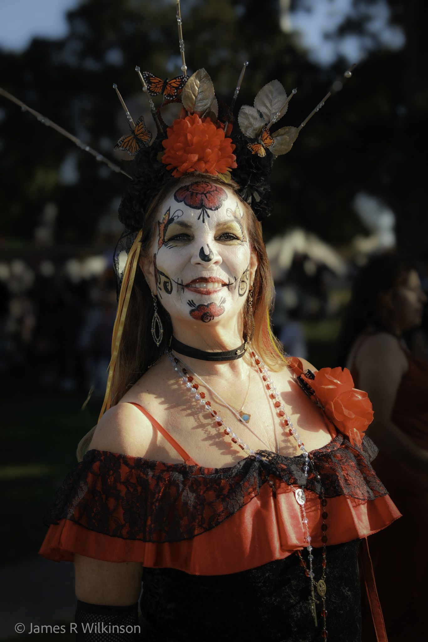 Jim participated in both the Nov 1st Old Town Dios de los Muertos meetup and the Nov 5th UCSD Fallen Star moonrise. For the Old Town Dios de los Muertos images, he used a Fujifilm X100VI in 50mm mode to capture the portraits. This camera has a small built-in flash he used as fill flash to reduce shadows especially on backlit shots. This camera has a leaf-shutter so it can flash-sync at any shutter speed, even 1/4000. It has a 35mm equivalent fixed focal length lens, but can “zoom” (crop in-camera) to 50mm or 70mm.